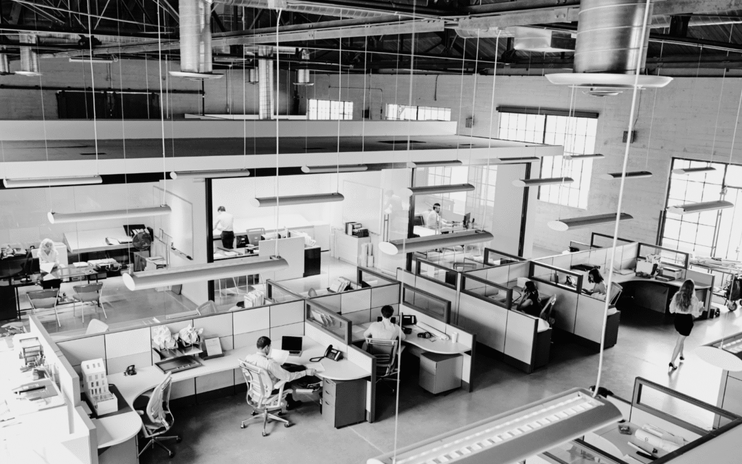 Elevated view of a busy open plan modern office
